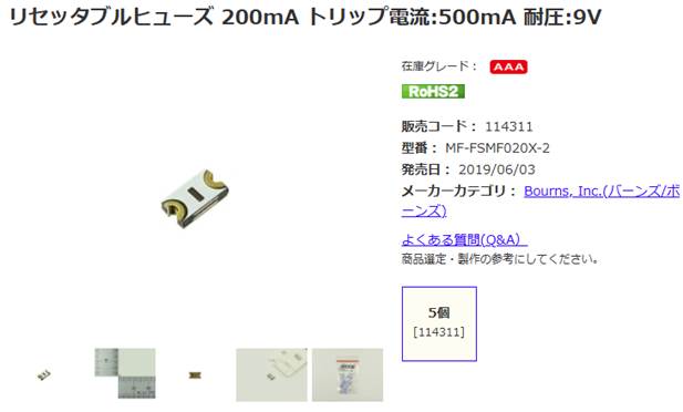 リセッタブルヒューズ 200mA トリップ電流:500mA 耐圧:9V: 受動部品 秋月電子通商-電子部品・ネット通販