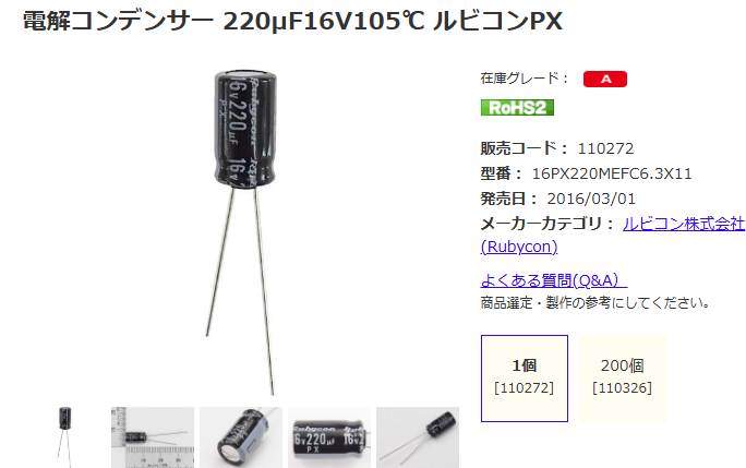電解コンデンサー 220μF16V105℃ ルビコンPX: 受動部品 秋月電子通商-電子部品・ネット通販
