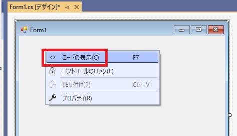 フォームデザインの上で、マウスの右クリック、「コードの表示」をクリックします