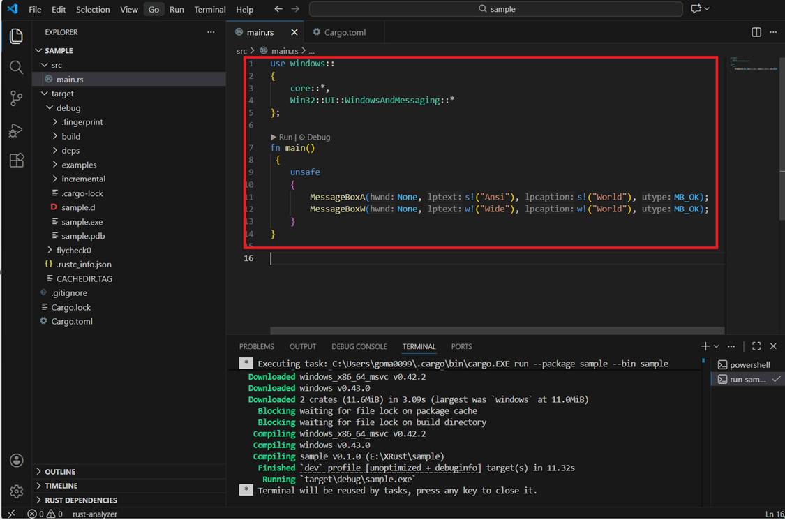 - また sample.exe を実行すると、黒い画面が起動した後で、メッセージボックスが表示されます