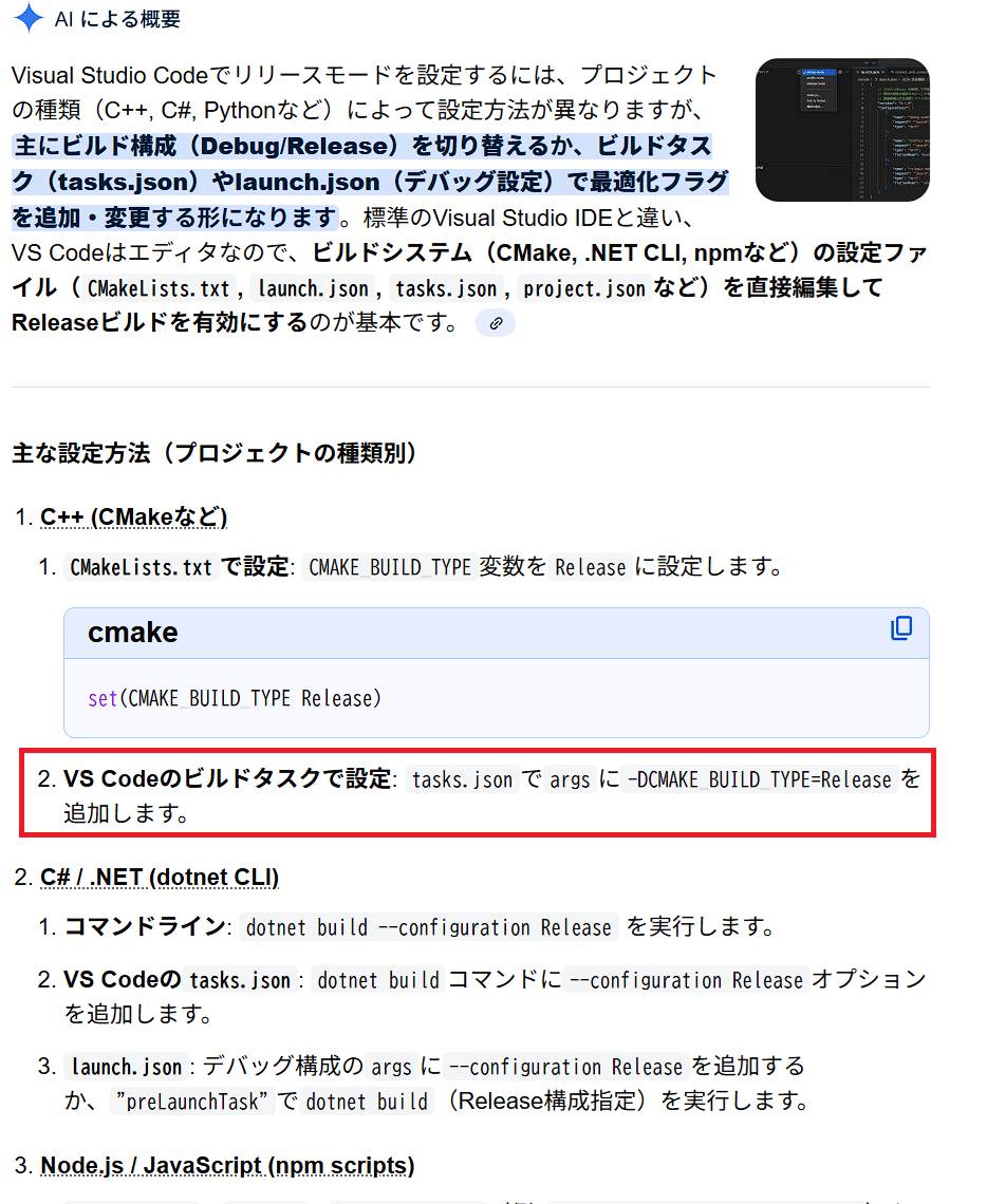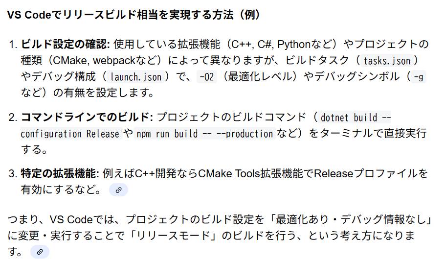 - TypeScript/JavaScript (tsc): tsc --build --force や uglify などのツールと組み合わせ、ビルドコマンドにリリース用オプション(圧縮など)を含めます。