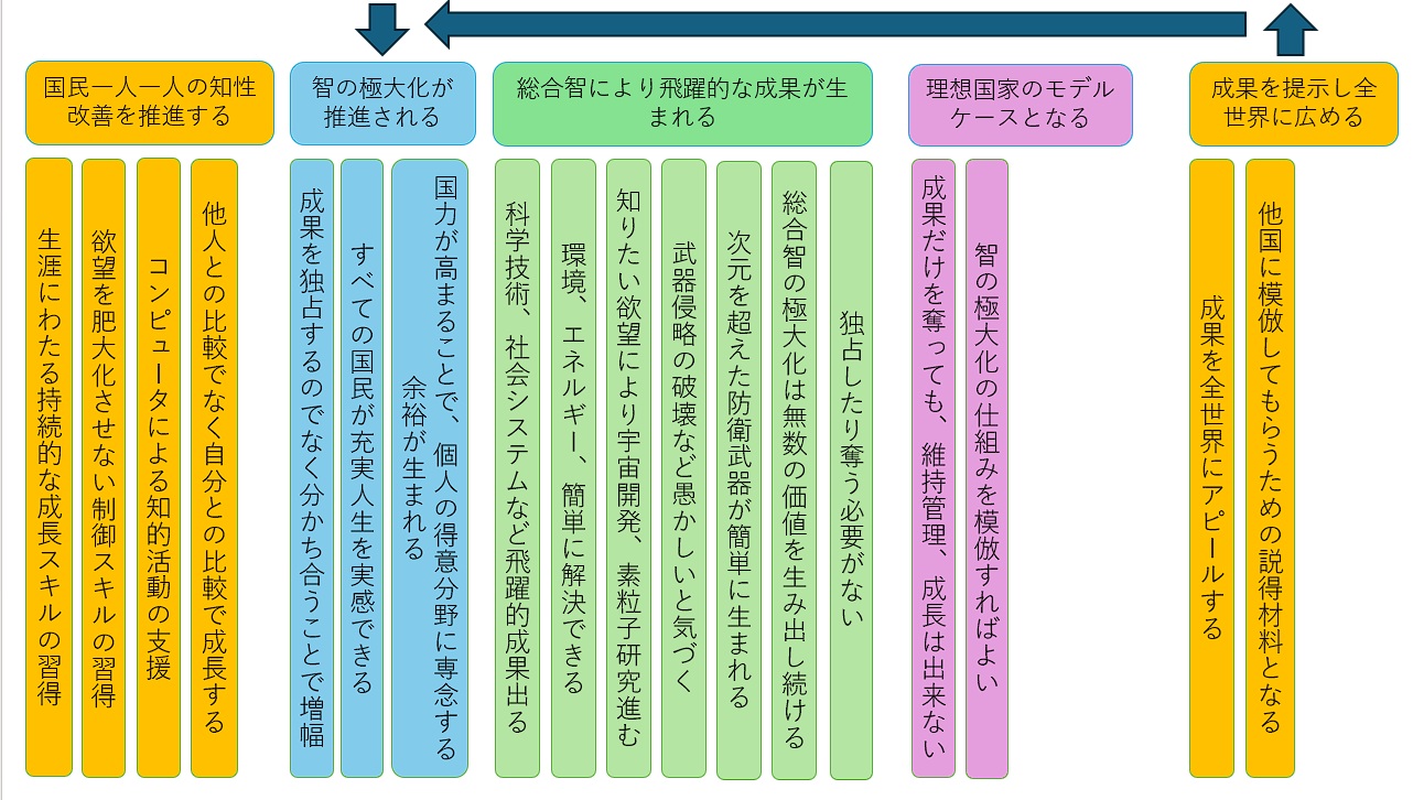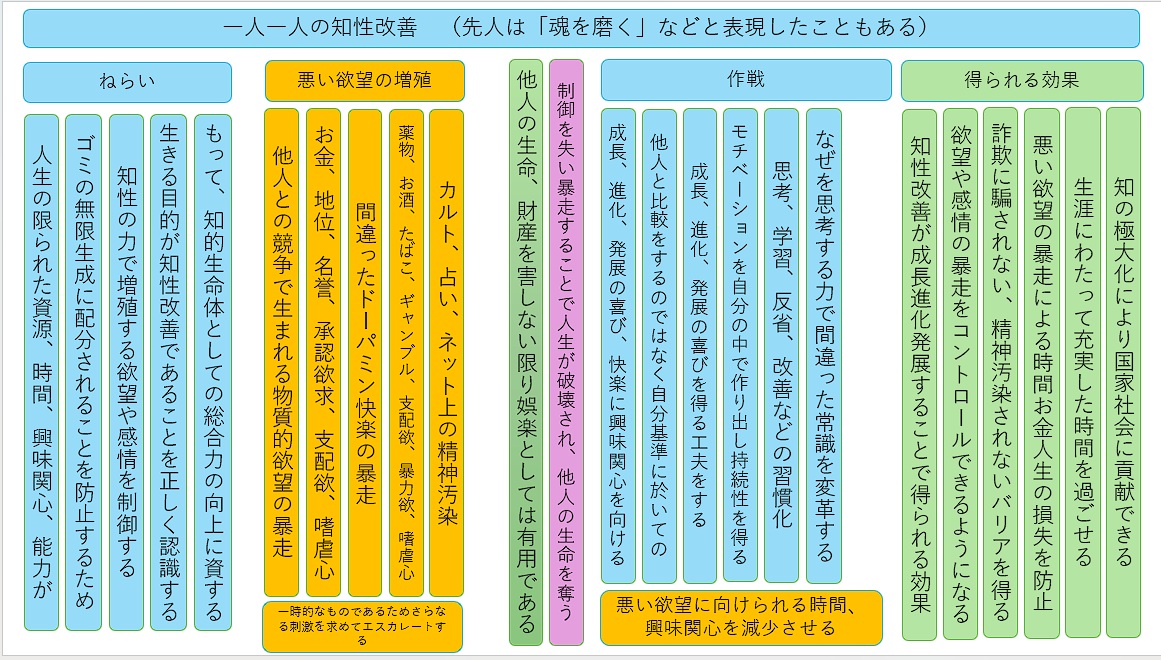 それぞれの時代を生きた偉人様の論説から導かれる共通項の一つに、人類の「知性、知識、見識、スキル」を極大化することで、人類が所属する共同体を「成長、発展、進化、変革」させ、永劫の安寧を得るという考え方があります。